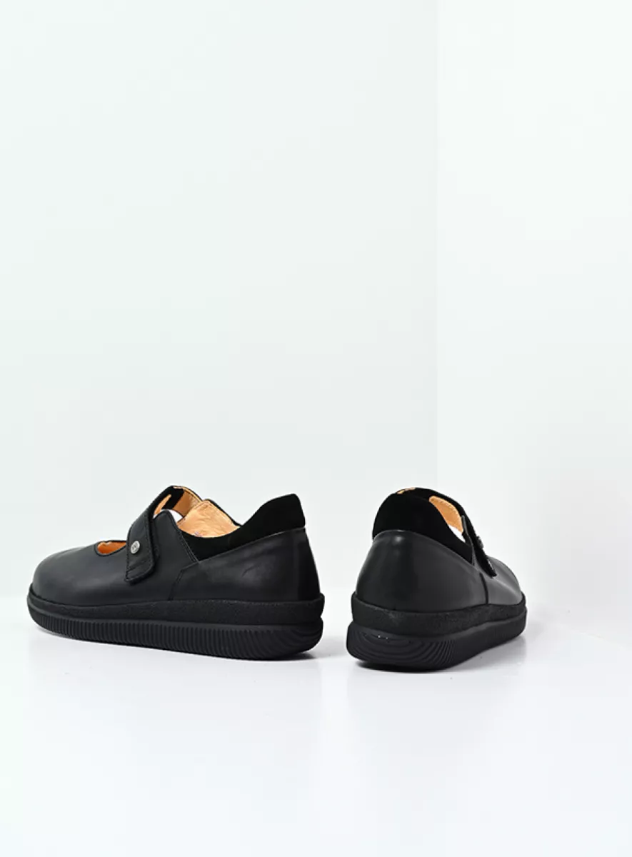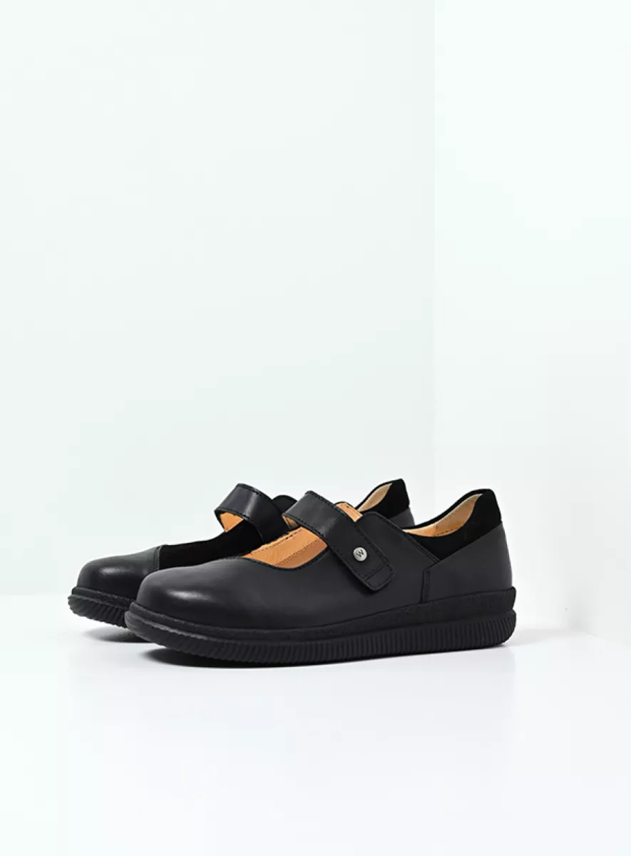 This model was made with all the features and benefits specifically to wide fitters. The Ultra-soft stretch leather on the inside gives that extra comfort for Hallux Valgus/bunions. A wide last, stable and lightweight outsole, extra allowance on the Velcro strap, along with a removable cork-latex footbed.